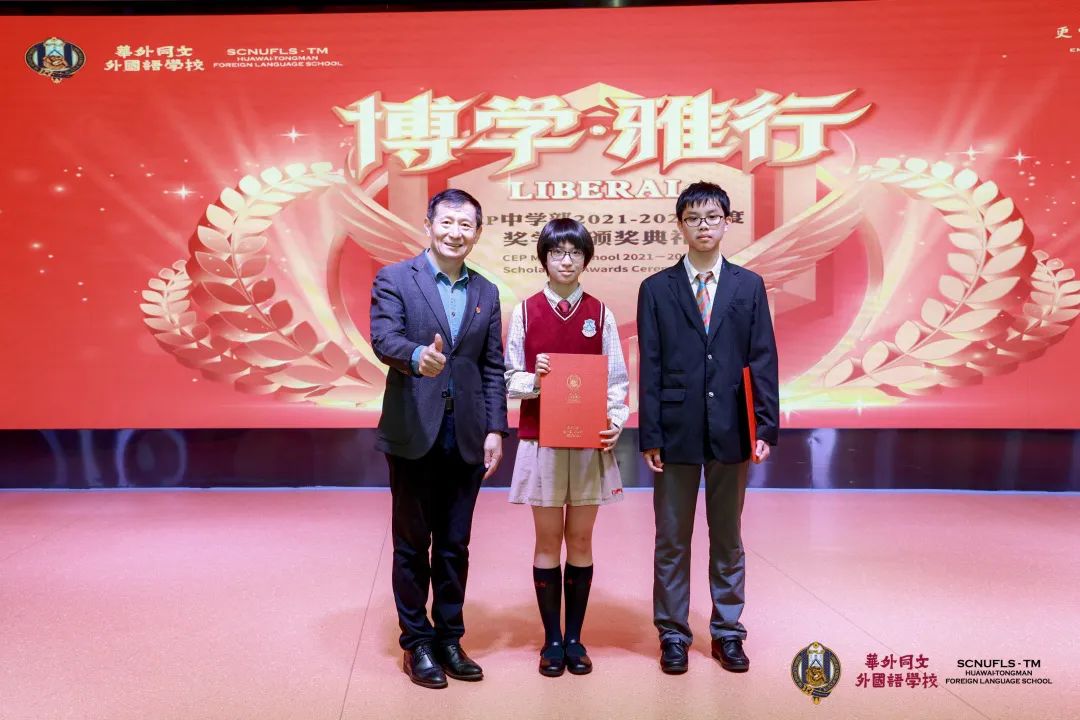 华外同文外国语学校副校长、CEP小学部校长任怀柱先生、CEP中学部副校长费安兴先生为获得博雅优秀直升学生奖同学颁奖。