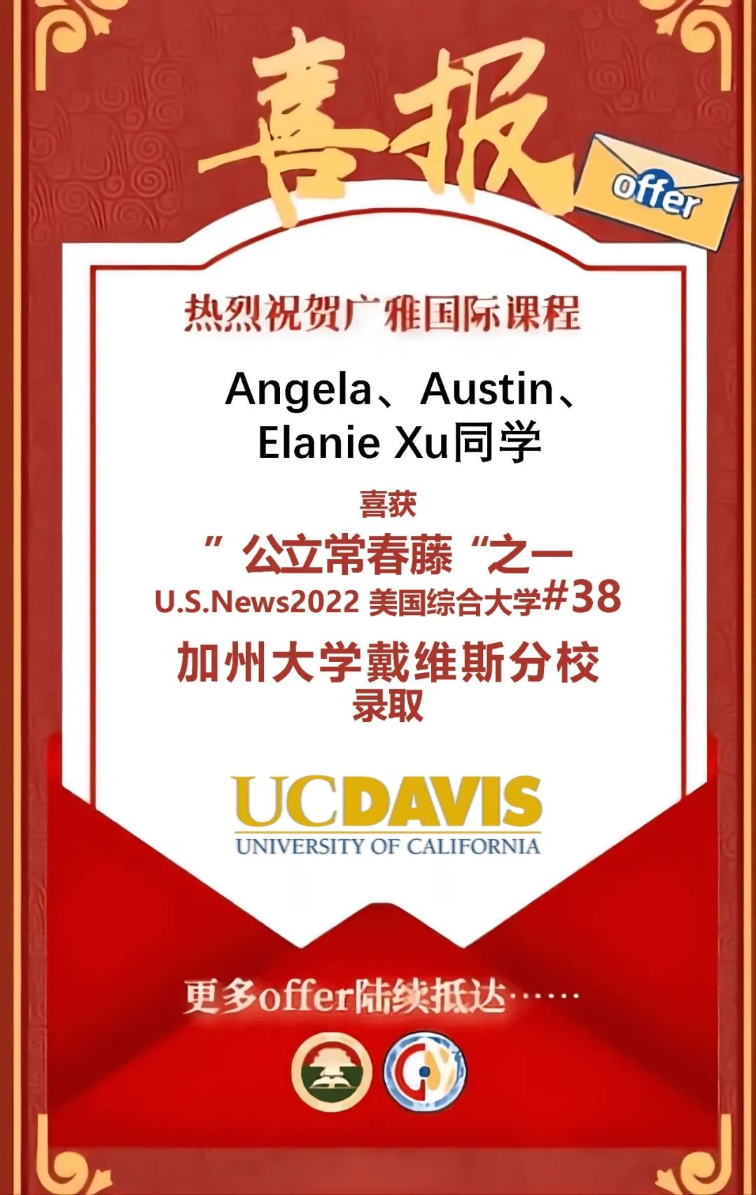 录取喜报 I广雅中学国际部收获 加州大学UC Davis offer +3