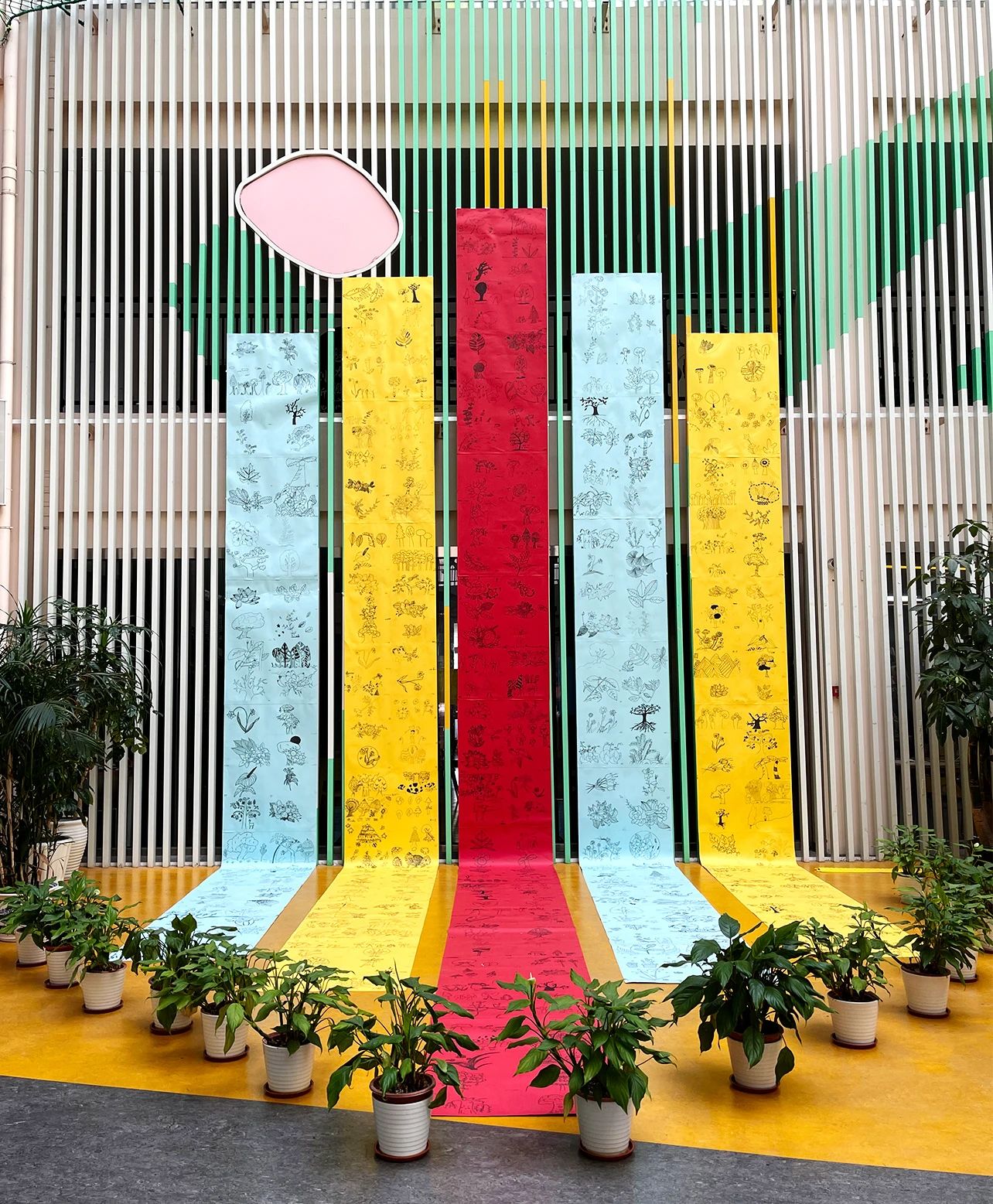 5天创作,5条巨幅画作,近500幅植物,从道尔顿中庭的2楼直立而下,9米、8米、7米红黄蓝三色错落相间排开,直铺地面,像是5道彩色光照亮了道尔顿5岁时的模样。