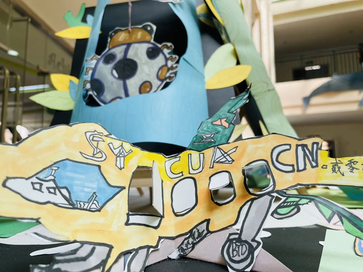 艺术楼五楼,“大片江山”都是Matt与不同年段学生一起“创造”出来的,墙上、地面、空中随处可见学生的艺术作品,称之为一个小型“创意制作艺术坊”一点也不为过。