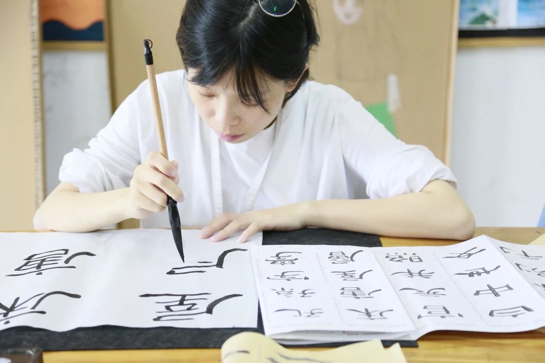 课堂上,黄老师正教授孩子们楷书,以颜真卿的《多宝塔》为范本,在最初学习执笔、用笔、结构和布局后,再进行深入学习。汉字书法为汉族独创的表现艺术,被誉为“无言的诗,无行的舞;无图的画,无声的乐”,能润物无声地提高人的修养和品德,“育人修身”的老师们也走进黄老师“书法”教师俱乐部,在大张书桌前端坐姿态,提起毛笔,横竖撇捺起来。