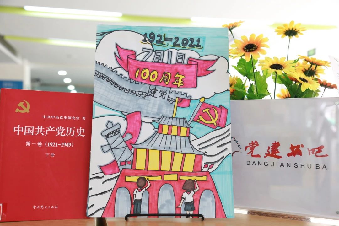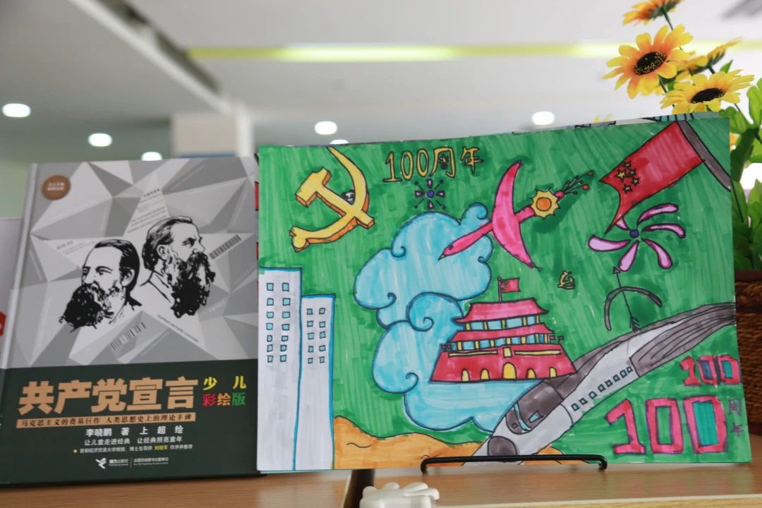 怎么样才能让作品看起来更有创意呢?有的孩子想起”古老的东方有一条龙,他的名字就叫中国”,有的孩子想到的我们的国宝熊猫,有的孩子则想到了飞机火箭运载工具的飞速发展,于是不同色彩、各有千秋的画作诞生了!将它们置于图书馆党建书吧的书籍中,也是一派祥和!
