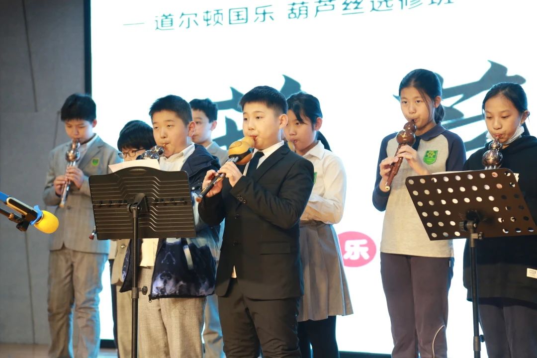 “天色等烟雨,而我在等你,”旋律温柔委婉、淡雅脱俗,是大家耳熟能详的现代中国风的乐曲《青花瓷》,在汇报演出时,学生吹出了“炊烟袅袅升起,隔江千万里”的悠远画面感。