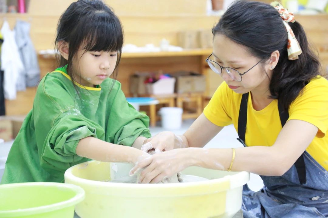 陶艺课的孩子们已经迫不及待地与老师们分享创意了,另一边的孩子则在老师的指导下拉坯成型,在陶泥的世界奇思妙想 ,每一处细节都是一道技术活儿,享受的过程也充分提升了孩子们的想象力与动手能力。
