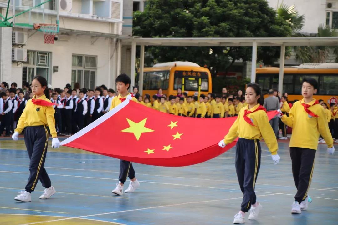 在激昂的运动员进行曲中,每个班级排着整齐的方阵,踏着整齐的步伐、喊着嘹亮的口号走进了运动场。伴随着雄壮的国歌声,鲜艳的五星红旗冉冉升起。大家行队礼或是注目礼,一起高唱国歌,嘹亮的歌声响彻校园。