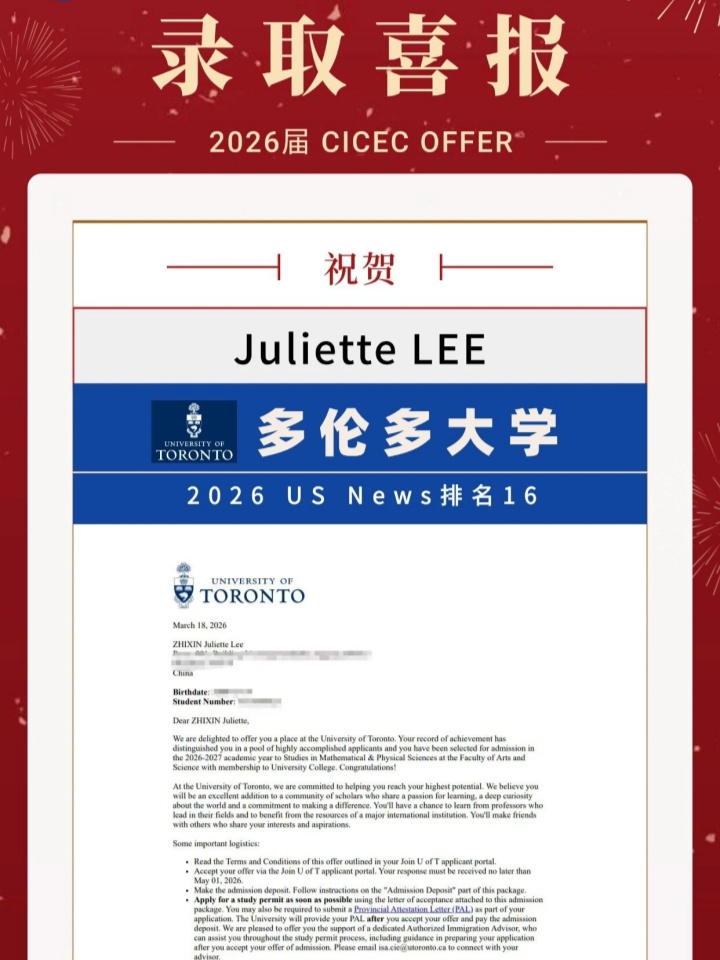 深圳市承翰学校(国际课程实验校区)| 录取喜报 | 承翰国际2026届毕业生获多伦多大学录取!