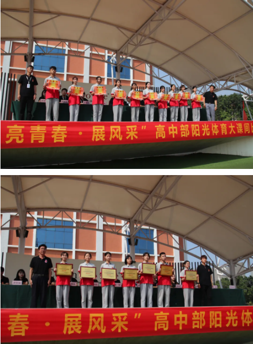 自信乐观,热情似火,各班的体育风采展示,打动了所有的观赛老师。裁判们秉着运动比赛“公平、公正、公开”的原则,当场打分,经过综合评比,选出此次大课间比赛的获奖班级,其中优秀奖10名,优胜奖7名,优秀指导教师7名,学校领导为获奖班级与个人颁发奖牌和奖状,并合影留念。