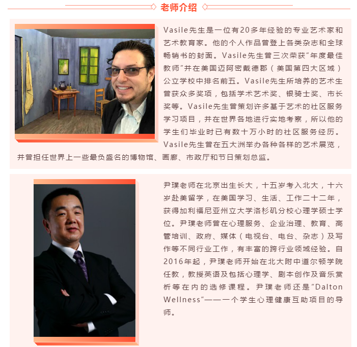 这门课适合有一定艺术背景及热爱艺术的学生。有志于往艺术方向发展或就读艺术学院的学生将从本课程中受益。通过这门课程,学生们既可以创作自己的艺术作品集或者单纯地从创作过程中寻找乐趣。学生们将通过简短的课堂讲授学习艺术大师的作品,探索他们的风格、概念、技巧,并帮助他们创作一个成功的艺术作品集。所有学生都将根据个人兴趣在各自的专业领域内进行创作,包括但不限于:插图、美术、室内设计、摄影、建筑、广告设计。本课程非常适合有兴趣开发自己原创创意作品集的学生。