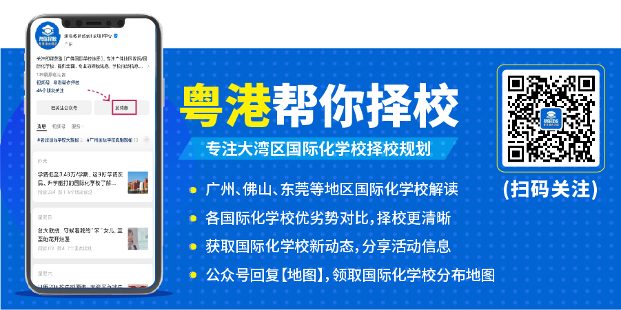如果您想要提前了解关于国际化学校的全面信息,家长们可以扫码关注“粤港帮你择校”公众号了解国际学校新资讯!