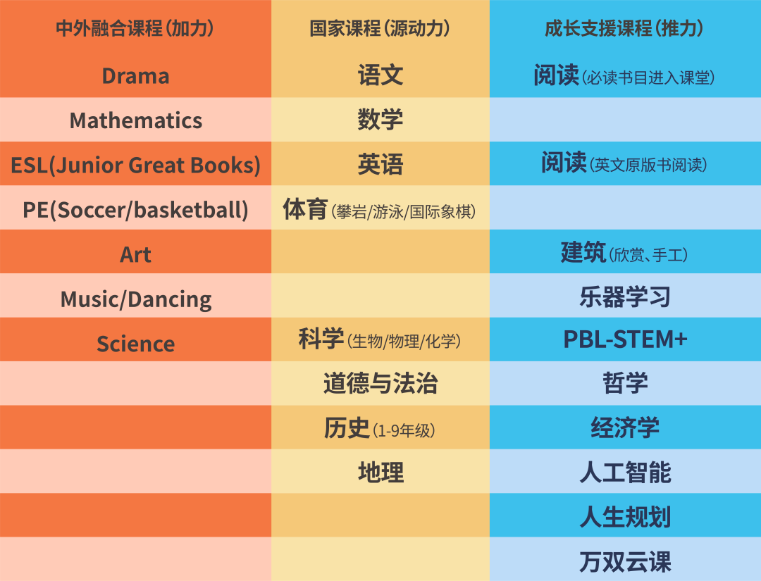 学校基于国家课程标准,设置了中西融合的、线上线下结合的、具有生活价值和未来视角的、为学生发展而发展的多元一体的万双课程体系,满足学生个性化全面发展需求。