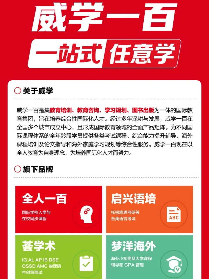 威学一百,主营国际学校、托福雅思语言等项目。