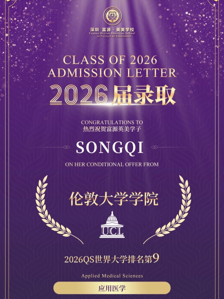 从G2的懵懂探索,到A2的从容笃定,三年时光,吕颂淇在FBAS的校园里,以舞蹈为翼,以学业为帆,在热爱与成长的双向奔赴中,收获了满满硕果。目前,她已斩获伦敦大学学院、伦敦大学国王学院、曼彻斯特大学共计3封心仪院校录取通知,专业都是她热爱的生物医学,为高中生涯画上圆满句点。01跳舞,是我释放压力的光2023.10月达人秀(来到FBAS第一次登台表演)从G2刚来到FBAS,我就一头扎进了舞台。三年里,我一共站上了九个舞台:达人秀、运动会、双旦演出,计划最后在毕业典礼上完美收官。2024年达人秀造型跳舞对我来说,不只是兴趣,更是我缓解课业压力最有效的方式。在一次次排练和磨合中,我认识了很多志同道合的好朋友,也慢慢锻炼出团队协作、沟通协调的能力,还有领导力。舞蹈室,是我在学校最喜欢的地方。真的很感谢学校,给了我们这么多上台发光的机会。25年11月趣味运动会大家一起跳开场舞2025.12月双旦晚会朋友镜头下的我02从拼命要强,到学会取舍2025年暑假研学·做有关乳腺癌的学术海报这三年,我的心态变化特别大。G2的时候:我好胜心特别强,总想着身兼数职、把所有事情都做到最好,课余时间几乎全用来复习备考、学课外知识。AS阶段:课程难度一下子上来了,学习压力也变大。我慢慢懂得,学习很重要,但身心健康更重要,要学会给自己减压,才能在考试里正常发挥。我也参加了很多校外学术项目,见到了很多很厉害的人,终于明白:人无完人,虚心向别人学习、同时专注做好自己,才是最重要的。凝胶电泳实验A2这一年:我终于找到了自己真正喜欢的方向——生物医学。也慢慢懂得,人要学会取舍,放弃不合适的,才能收获真正想要的,放弃即收获。03我的生物高分小秘诀很多同学问我生物怎么拿高分,其实没有捷径,只有三个小习惯:坚持滚动复习持续学习比临时抱佛脚有用得多。给自己定计划,每天/每周背固定知识点,还可以找同学或老师互相检查。2.笔记+错题一起记在原来的笔记旁边,直接把真题错题抄在对应知识点旁边,复习的时候一目了然,查漏补缺特别高效。3.一定要紧跟老师节奏课上认真听,课后作业认真完成。可以根据自己的薄弱点针对性复习,但一定要相信老师的复习方法。04写给学弟学妹:过程里的自己,最珍贵24年10月5日拍到了粉紫色的天空,好浪漫在每一年的学习中都会存在很多困难,很多时候你们付出了努力结果却不尽人意,但请不要困在当下的“失败”里,只有收拾好情绪和吸取经验才能使你们走得更远,结果也许重要,但在过程中那个不断重塑的自己才最珍贵。新的学期,祝愿你们能在如愿与遗憾里,都能慢慢成为更好的自己。愿每一位FBAS学子都能在热爱与坚持中奔赴属于自己的光明未来!如果您想要提前了解关于国际学校的全面信息,家长们可以扫码关注“帮你择校”公众号了解国际学校新资讯!*综合内容来源学校,如有不妥,请告知。