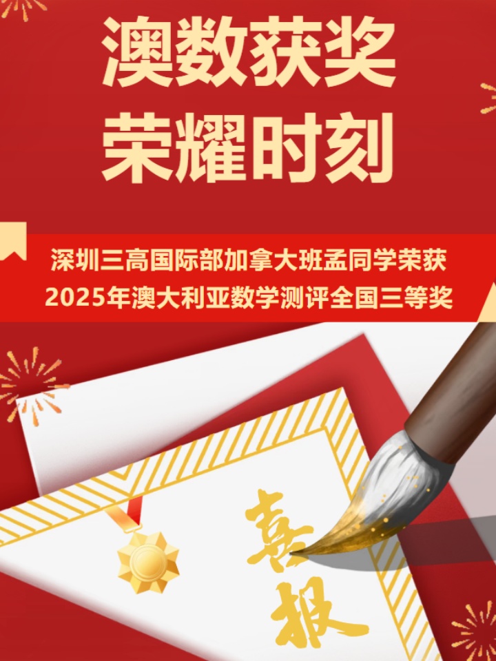 在学术的浩瀚海洋中,每一次挑战都是一次成长的机遇,每一份荣誉都是努力的见证。近日,深圳市第三高级中学国际部加拿大班传来喜讯,2024级的孟同学在今年9月举行的2025年澳大利亚数学测评(AMC)中,凭借出色的发挥和扎实的知识储备,喜获全国三等奖。这一成绩充分展现了加拿大班学子扎实的数学功底、优秀的逻辑思维能力和卓越的综合素养,也是加拿大班国际化人才培养成果的又一体现。获奖成就:澳数AMC的含金量在2025年度的澳大利亚数学测评中,孟同学凭借扎实的数学基础、敏锐的逻辑思维和出色的临场发挥,从众多参赛者中脱颖而出,荣获全国三等奖。澳大利亚数学测评根据学生年级分为不同难度级别,题目设计巧妙,强调逻辑推理和创造性思维。孟同学能够在这一具有挑战性的国际性赛事中获奖,反映了加拿大班数学教学的扎实成效和个性化培养的成果。赛事权威:全球认可的数学测评平台澳大利亚数学测评(AMC)是全球规模最大、历史最悠久的校际数学竞赛之一,由澳大利亚数学联合会(AMT)主办。该测评旨在丰富各个阶段学生的数学教育,提供更前沿的数学思想、理论动态和教育资源,在全球范围内享有盛誉。AMC试题设计注重激发数学兴趣、培养逻辑思维和解决问题能力,考察内容涵盖代数、几何、组合数学和数论等多个领域。其成绩被全球众多高校认可,是衡量学生数学能力的重要参考依据。能够在这一权威赛事中获奖,充分证明了孟同学在数学领域的优秀能力培养模式:国际化课程体系赋能深圳市第三高级中学国际部加拿大班以加拿大安大略省高中课程(OSSD)为核心,融合AP课程、雅思课程及学科竞赛辅导,形成多元化的课程体系。这种“OSSD+AP+竞赛”的课程组合为学生提供了全面发展的平台。在数学教学方面,加拿大班注重培养学生的数学思维和应用能力,采用小班分层教学模式,根据学生个体差异提供个性化指导。同时,学校积极组织学生参加各类国际数学竞赛,以赛促学,提升学生的学术竞争力。师资力量:专业指导成就卓越深圳市第三高级中学国际部加拿大班拥有一支高素质、专业化的教师团队。所有教师均来自国内外知名高校,具备丰富的国际教育经验和专业背景,能够为学生提供高水平的教学和竞赛指导。在孟同学备赛过程中,数学教师团队提供了系统化的培训和个性化指导,针对AMC的题型特点和解题策略进行了专项训练。这种专业的备赛指导,帮助学生更好地把握竞赛要求,发挥出最佳水平。未来展望:以竞赛促进全面发展澳大利亚数学测评获奖不仅是孟同学个人的荣誉,也是加拿大班国际教育成果的体现。将继续鼓励和支持学生参与各类国际竞赛,以赛促学,提升学生的国际竞争力。深圳市第三高级中学国际部加拿大班将继续为學生提供优质的加拿大OSSD课程资源和平台,培养更多具有国际视野和创新精神的优秀人才。期待孟同学在未来的学习生涯中再创佳绩,也期待更多学子在国际舞台上展现深圳三高的风采!加拿大班/法语班:高中直升全球顶尖大学本科英法双语班:高中直升世界一流大学本科深圳市第三高级中学国际部加拿大名校精英班采用灵活的学分制教学体制,突破传统应试教育的束缚,为学生提供灵活且科学的学术规划。70%平时作业+30%考试成绩的评价模式,更关注学生的学习过程和综合能力培养,帮助学生充分发挥潜力,开拓更广阔的未来发展空间。OSSD课程:全球名校通行证OSSD课程广受加拿大、美国、英国、澳大利亚、新加坡、中国香港、中国澳门等国家和地区顶尖高校的高度认可。学生通过OSSD成绩及雅思成绩(AP成绩及竞赛奖项为加分项),无需参加统一的国际升学考试,直接申请全球一流大学。AP课程:提高升学竞争力OSSD成绩是通向世界顶尖高校的核心保障,AP课程则为申请锦上添花,帮助学生在激烈的大学申请中脱颖而出:•全球认可度高:AP课程被全球60多个国家、约2400所大学认可,能够换取大学学分或提高申请竞争力。•挑战性强:AP课程提供大学水平的学术训练,展示学生的学习能力和学术潜力,是申请顶尖大学的有力证明。•专业方向明确:AP课程覆盖多学科领域,帮助学生深入探索兴趣和未来专业方向,为大学学习打下坚实基础。法语课程:留学性价比超高法语国家的留学费用相对较低,适合大多数中产家庭。以法国为例,公立大学免学费,仅需缴纳少量注册费(年注册费大约为几百欧元至上千欧元),年均留学费用不到10万元人民币(本科三年留学费用三十万人民币)。与美加英澳新等以英语为授课语言的大学相比,法语留学的费用更为亲民。毕业生成果斐然:直通世界名校多国联申保障:依托“加拿大+澳洲+欧洲”等多轨道申请策略,毕业生人均收获3国以上录取,规避单一申请风险;历届毕业生凭借OSSD和AP课程的双重优势,已被以下全球顶尖高校录取。2021届至2024届毕业生累计斩获奖学金123万加元、1万英镑、2.4万澳元、7千欧元(折合人民币约666万元);2025届学生累计获奖学金151.91万加元、16.31万澳元、8万美元(折合人民币约942万元);•加拿大:多伦多大学、麦吉尔大学、英属哥伦比亚大学等•美国:匹兹堡大学、宾夕法尼亚州立大学、亚利桑那大学等•英国:曼彻斯特大学、伦敦国王学院、布里斯托大学等•澳大利亚:墨尔本大学、悉尼大学、新南威尔士大学、澳国立大学、昆士兰大学等•其他地区:荷兰格罗宁根大学、新