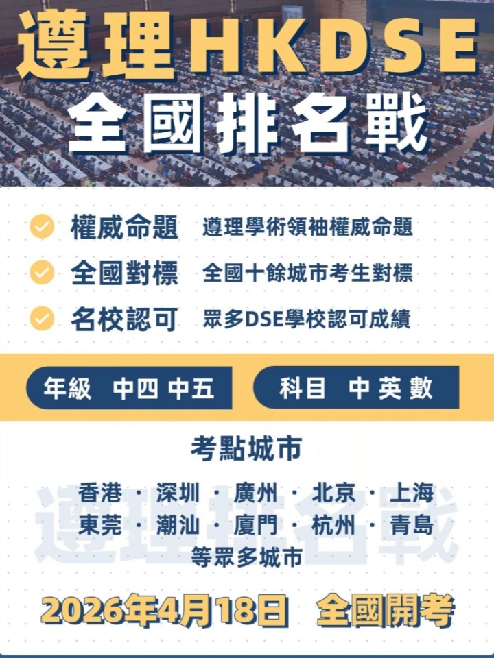 2026年香港中学文凭考试(HKDSE)笔试将于4月8日正式开考,2026届考生已进入备考冲刺的关键期。据香港考评局官方数据,2026年HKDSE报考人数达5.85万,较2025年增加5%,其中自修生报考人数突破1.21万人,较2025年增加18%。过去三年,自修生报考人数大幅增加,2026年较2024年增加近70%,竞争压力逐年上升。HKDSE考试作为国际化学术考试,HKDSE学生需要面对5万余名考生的竞争压力。对于目前在读HKDSE课程的中四、中五学生,实时掌握自身学习情况及全面排名尤为重要。为了帮助中四、中五学生精准掌握自身学习情况,了解自身在全国考生中的学习排名,香港遵理集团在全国热点城市举办「遵理HKDSE全国排名战」,为全国考生搭建精准对标的学术平台。01考试亮点1遵理学术领袖权威命题遵理创始人级学术领袖担任命题组长,遵理命题专家组负责考试命题,特邀香港教育图书有限公司专家担任学术顾问,参照香港考评局HKDSE考核要求,并适配中四、中五学习特点,帮助考生提前了解HKDSE考试规律及命题趋势,确保赛事测评的权威性、专业性与精准性。2全国十余城市考生对标全国十余城市考点同步开考、统一考评,考后一周即向学生发布「考生全国对标报告」,帮助学生精准对标、高效学习。3众多DSE学校认可成绩遵理自营校区及伙伴学校认可成绩,作为入学测试参考依据,精准链接优质教育资源。4赠送解卷课程及精美奖品考后赠送「线下解卷课程」,名师亲自讲授考试要点及核心知识,详细诊断学生学习情况;考后举办颁奖仪式,基于全国排名及城市排名,向优秀考生颁发精美奖品。02考试概况●考试名称:遵理HKDSE全国排名战●考点城市:北上广深及其他热点城市●考试科目:英文、数学、中文●命题单位:遵理命题专家组●命题标准:参照HKDSE考核要求,适配中四五学习特点●考试服务:对标报告、解卷课程、排名奖项如果您想要提前了解关于国际学校的全面信息,家长们可以扫码关注“帮你择校”公众号了解国际学校新资讯!*综合内容来源学校,如有不妥,请告知。